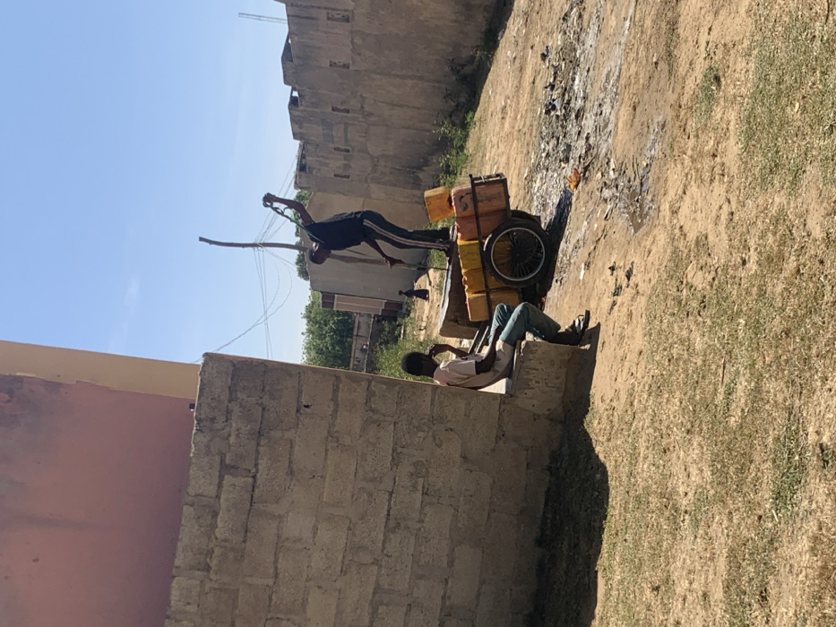 The scene depicts an outdoor environment in Dabawa, Nigeria, under a clear blue sky with direct sunlight. In the foreground-left, a young male wearing a light-colored t-shirt, dark trousers, and sandals sits on a low concrete ledge built into a concrete block wall. His right hand is raised towards his face. To the right, another young male, dressed in a dark t-shirt and dark striped athletic pants, stands on a two-wheeled handcart. This cart carries multiple yellow and orange plastic jerry cans. The male on the cart is actively using a dark, elongated tool with a chain or rope mechanism, manipulating it over the containers, suggesting water transfer. The ground is unpaved, consisting of dry, light-brown earth with patches of dry grass and a distinct wet, muddy area directly beneath and to the right of the handcart. In the far background, a small, indistinct human figure stands near distant concrete block structures. The background also features scattered green vegetation and more unpaved ground.