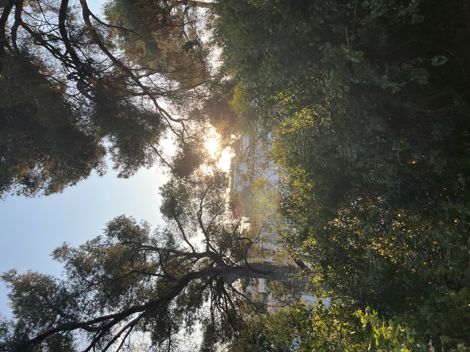 The image depicts a view looking up through trees towards a bright sky with the sun shining through the foliage. The left side shows the silhouettes of pine tree branches with dense foliage. The right side is filled with lush green trees, catching sunlight. A building is visible in the middle of the image, partially obscured by the trees. The perspective is from ground level looking vertically upwards.