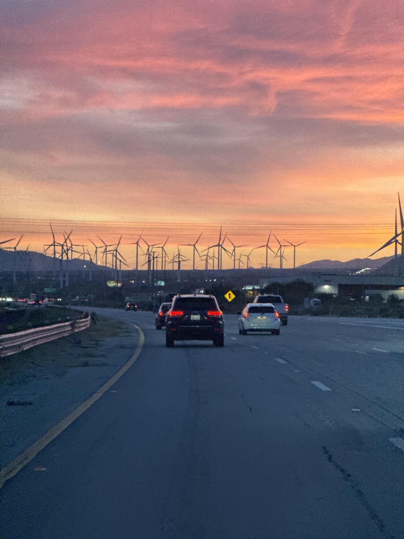 The image captures a highway scene in Desert Hot Springs, United States, under a vivid sunset sky. In the foreground, vehicles are travelling along the road, including a dark SUV in the middle lane and a white car in the right lane. Further in the distance, there are wind turbines dotting the horizon, indicating the presence of a wind farm. A pedestrian crossing sign is visible on the right side of the road. The sky displays a gradient of colors, ranging from orange to pink, as the sun sets. The overall environment suggests a twilight setting on a highway near a renewable energy installation.