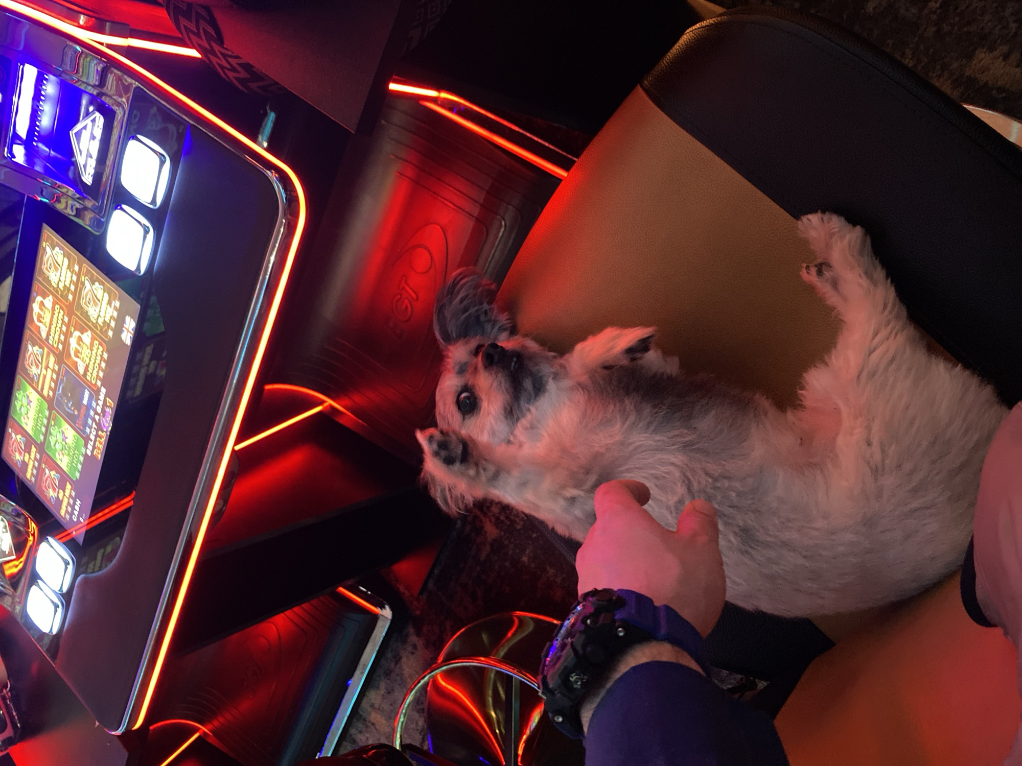A dog is lying on a chair next to a lit slot machine. A hand reaches out towards the dog. The hand has a dark blue wristwatch on the wrist. The dog is white and gray, with its paws in the air. The chair is tan and black. The slot machine has red and white lights. The screen shows a slot game. The location is in a casino, likely in Nesebar, Bulgaria.