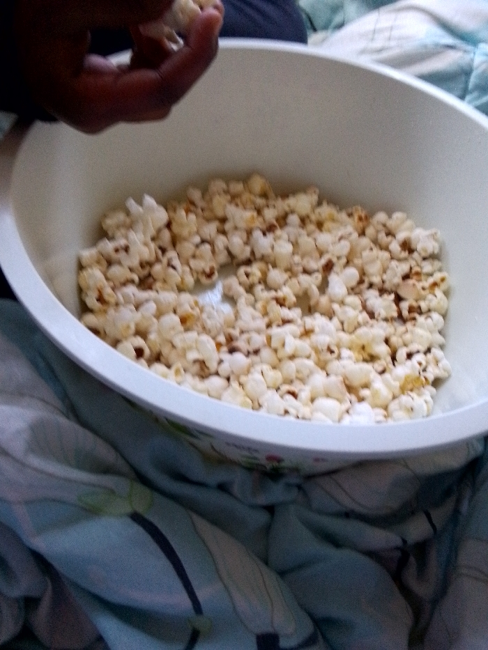 An indoor domestic setting in Unknown, Unknown, displays a white oval bowl containing a substantial quantity of popped popcorn