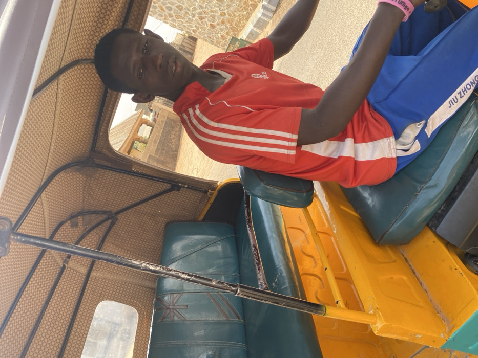 A young Black male is depicted in a medium shot, seated within a yellow and dark green auto-rickshaw (Keke Napep) in Barakin Akawo, Nigeria, during daylight hours