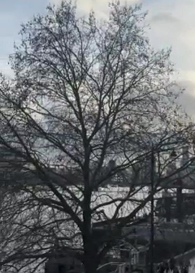 view of the London Eye in London, England. The view is partially obstructed by a tree with bare branches, and the London Eye is across a body of water, possibly the River Thames. There are people walking on a sidewalk in the foreground, and street lamps are visible. The sky is cloudy. The video pans to the right to reveal the London Eye more clearly.