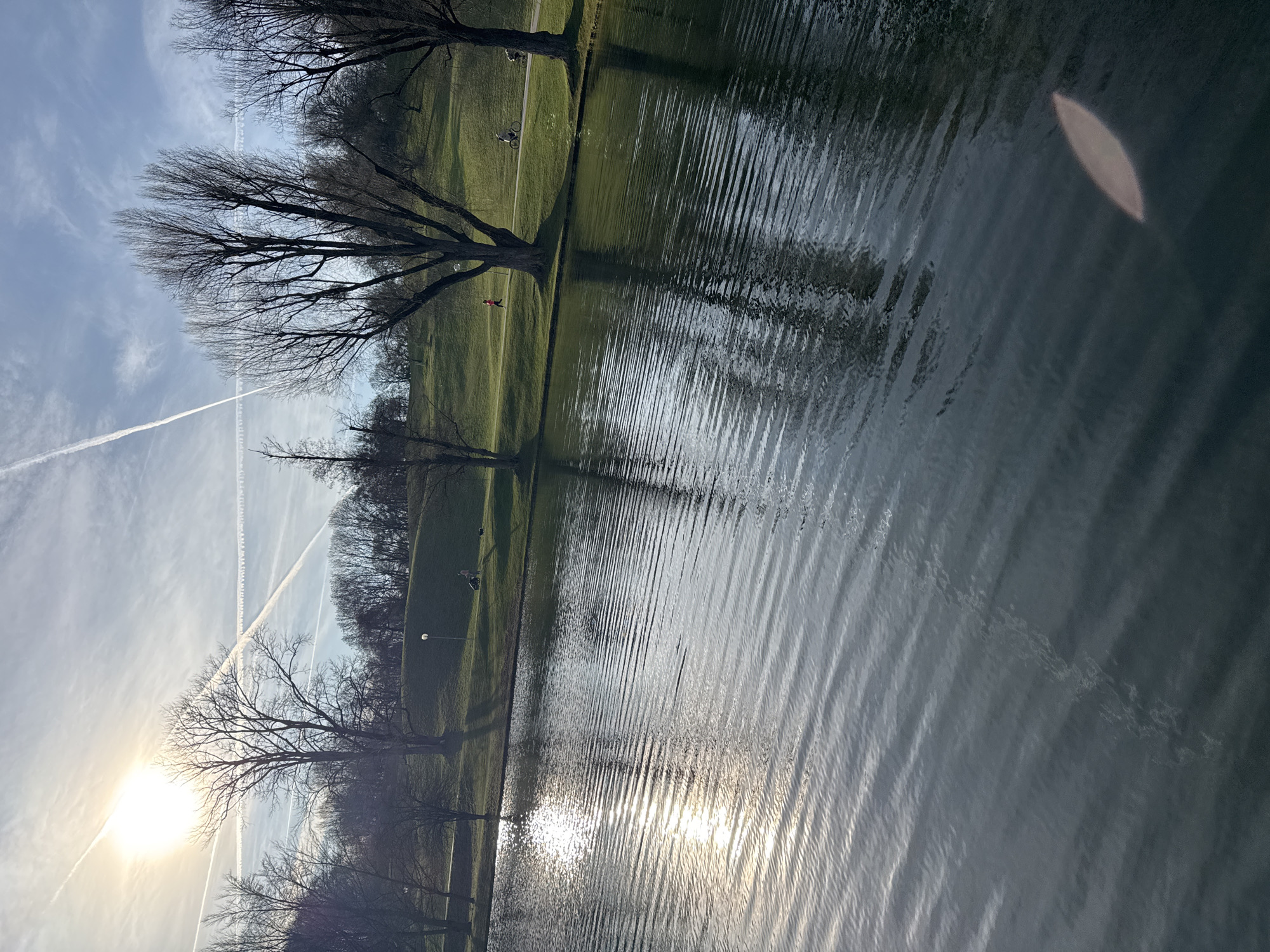 This image depicts a sunny outdoor scene within Olympiapark in Munich, Germany, featuring a body of water adjacent to a grassy embankment under a partly cloudy sky. The lighting indicates late afternoon or early morning. The lower two-thirds of the frame are dominated by a large, calm body of water, likely a lake or pond, exhibiting numerous parallel ripples across its surface. Intense sunlight reflects brightly on the water's left side. Bare tree reflections are visible in the water. A light-colored, oval-shaped object is submerged approximately 20-30 centimeters below the surface near the bottom right corner. Above the water, a green, gently sloping grassy embankment ascends towards the background. Numerous bare deciduous trees with visible branches are scattered across this embankment and line the water's edge. A paved pathway runs horizontally across the mid-ground of the embankment. A single street lamp with a white, spherical light fixture is positioned on the upper slope of the embankment, slightly left of the image center. Several individuals are present on the embankment: * One individual wearing a red top is running leftwards on the paved path. * Two individuals are cycling leftwards on the paved path, positioned to the right of the runner. * On the upper grassy slope, to the right of the street lamp, one person is pushing a dark-colored stroller, with a dark-colored animal, possibly a dog, nearby on the grass. * Two additional, distant human figures are discernible on the grassy slope: one near a large central tree and another to the left of the street lamp. The sky is partly cloudy with multiple distinct white contrails crisscrossing the upper atmosphere. The sun, a bright glare, is visible in the upper left quadrant.