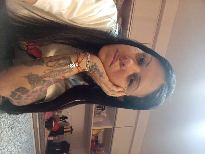 An adult female is depicted in a medium close-up, indoors, in what appears to be a kitchen setting in Lomas de Zamora, Argentina. She has long, dark hair and is facing the viewer with her right hand supporting the right side of her jawline. Multiple tattoos are visible on her right arm, including detailed imagery and a patterned design resembling leopard print on the outer bicep/tricep area. A small tattoo is also present on her right hand. She wears a light-colored t-shirt, partially revealing a graphic with a red bow. On her left wrist, she wears a multi-strand silver-colored bracelet and red string bracelets featuring a silver-colored Celtic knot charm. Her expression is neutral. The background shows light-colored upper kitchen cabinets and open shelving on the right, containing various glass jars, bottles, and a red mug. A dark, speckled countertop occupies the lower right, displaying a black coffee maker, a black mug, and a utensil holder with dark-handled utensils. Overhead lighting is evident in the upper center.