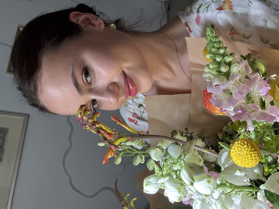 A young adult female is depicted in a close-up, chest-up shot, looking directly at the camera with a subtle smile. She has fair skin, dark hair pulled back, and is wearing a light-colored floral patterned dress or top. A thin chain necklace is visible, along with a small stud earring in her left earlobe and a small, light green teardrop-shaped dangle earring in her right earlobe. She is holding a large, multi-species bouquet of flowers. The bouquet includes prominent orange and yellow tubular flowers, light green-white bell-shaped flowers or buds, a bright yellow spherical flower, light purple-pink elongated flowers, and an orange-red protea-like bloom. The lower portions of the flower stems are wrapped in two sections of brown craft paper. The background consists of a light gray wall featuring a subtle, dark gray wavy line pattern. A framed piece of art, depicting a monochromatic scene, is visible on the upper left wall. The scene is illuminated by natural light. The specified location is Tel Aviv-Yafo, Israel.