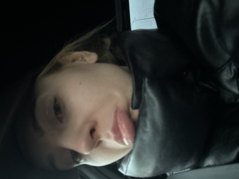 The image displays a dimly lit, close-up selfie of an individual, likely female, captured from the chest up within what appears to be a vehicle interior