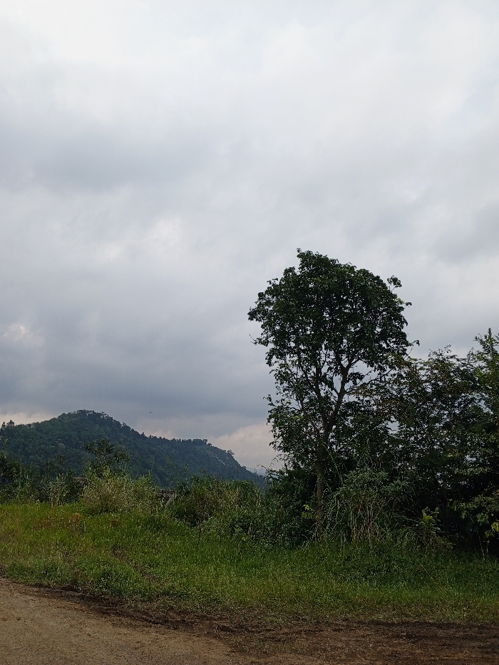 This image depicts a natural outdoor scene in Thotagamuwa, Sri Lanka, under an overcast sky. The foreground features a light brown dirt path or track, with tire marks or indentations visible, extending along the bottom of the frame and slightly curving right. Directly above the path, a strip of green grass and mixed wild foliage occupies the lower mid-section. In the midground, a prominent, tall deciduous tree with dark green leaves stands centrally to the right, its full canopy filling a significant portion of the sky. To the right of this main tree, additional dense, dark green foliage and smaller trees are visible. The background reveals a range of hills or mountains, heavily covered with dark green trees and vegetation, extending across the left half of the frame. The sky above is largely cloudy, presenting a uniform light grey to darker grey appearance, indicating overcast weather conditions. No people or animals are explicitly visible.