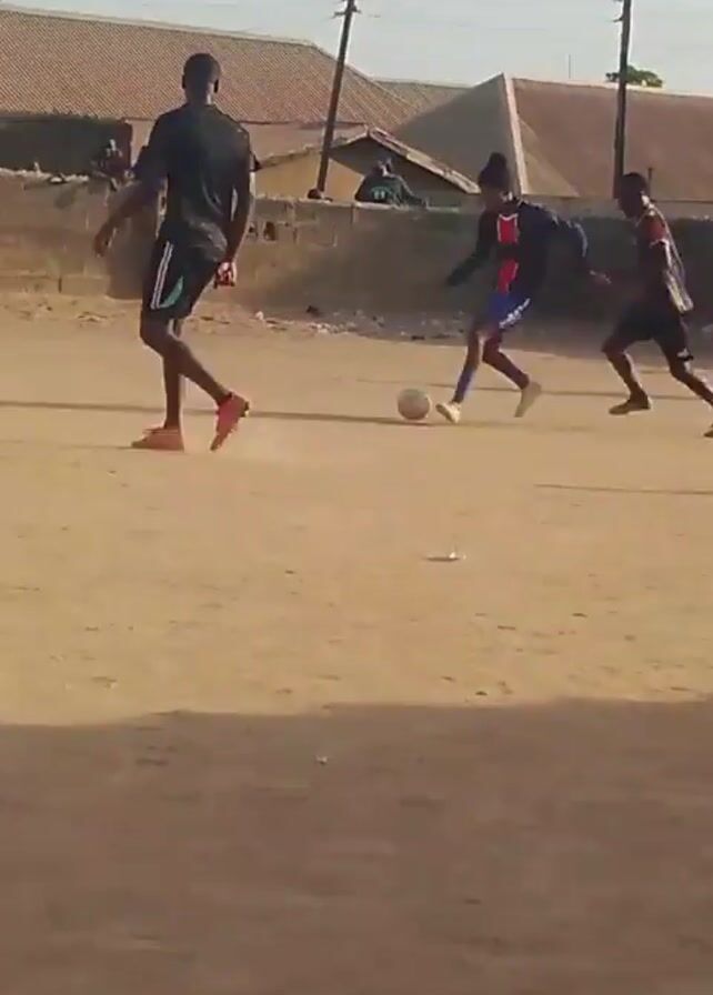 group of young men playing soccer on a dirt field. There are at least four people actively playing, dressed in sports attire. The environment is sparse, with buildings and greenery in the background. The video pans from left to right to follow the action of the game, capturing moments of running, kicking the ball, and general play. The surface of the field kicks up dust as the players move around.