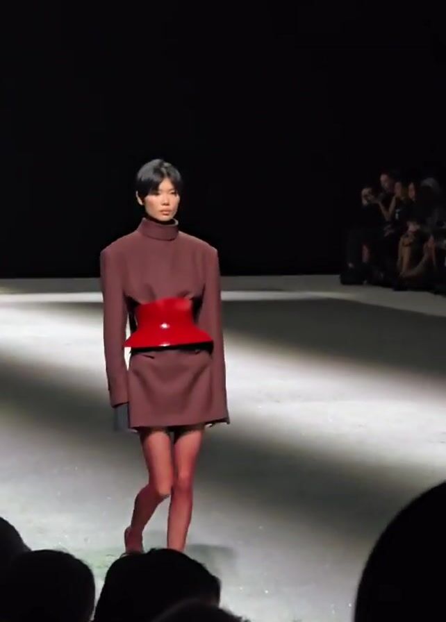 A female model walks down a runway during a fashion show. She is wearing a brown turtleneck dress with long sleeves that end in black gloves. A large, red, glossy, semi-circular piece of material that acts as a waist cincher wraps around her waist. Her legs are covered with red tights and her feet are in matching flats. Her hair is short and black. The runway is grey and speckled with tiny white dots. A crowd sits on both sides of the runway, watching the show. The background is black.