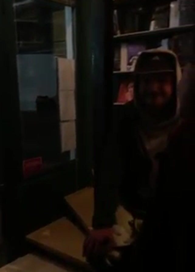 interior of a dimly lit bar. Initially, a man with a baseball cap and a hooded jacket is partially visible near the entrance. The camera pans to reveal the bar counter where he's standing next to a woman with shoulder-length brown hair. The bar features a cake under a glass dome, bottles of liquor on shelves, and other barware. The background includes a bookshelf decorated with string lights. Loud music is audible.