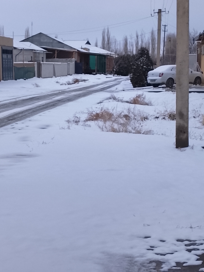 A snow-covered street scene features a road with tire tracks leading towards houses and utility poles in the background. Patches of dry grass peek through the snow in a strip between the road and the foreground. A white car sits parked on the right side of the road, dusted with snow. The sky is overcast, and the overall impression is a quiet, wintery day in a residential area.