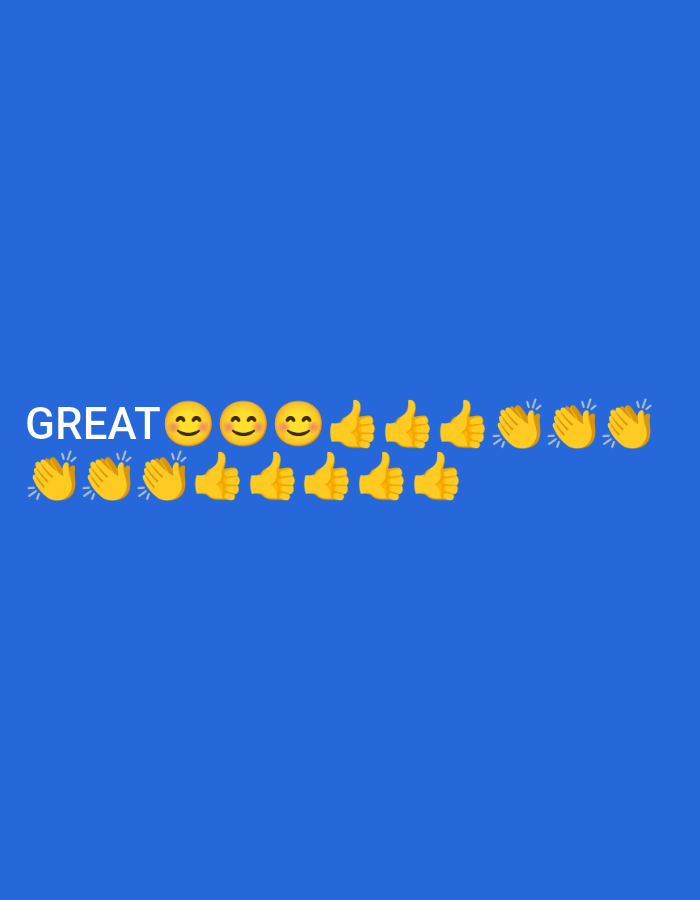 This is a digital graphic displayed on a solid royal blue background. The word "GREAT" is presented in white uppercase sans-serif letters, positioned on the left side of the frame. To the right of the text, a series of yellow emojis is arranged in two horizontal lines. The upper line consists of three smiling face emojis, followed by four thumbs-up emojis, and then three clapping hands emojis. The lower line, situated directly beneath the right portion of the upper line, comprises three clapping hands emojis, followed by three thumbs-up emojis. In total, the image contains three smiling face emojis, seven thumbs-up emojis, and six clapping hands emojis. No individuals, physical subjects, objects, actions, or interactions are depicted, and the environment is a digital canvas, not a physical location in any city.