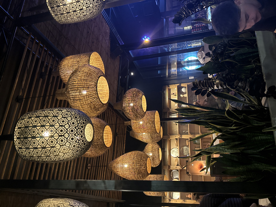 The scene depicts the interior of an establishment, likely a restaurant or bar, in Burgas, Bulgaria, observed during nighttime. The ceiling features exposed wooden slats or woven material, from which numerous pendant light fixtures are suspended. These fixtures comprise several large, dark-colored metal lanterns with intricate geometric cut-out patterns, alongside multiple woven rattan or wicker lamps in various spherical and teardrop shapes, all illuminated with warm light. In the mid-ground, a light-toned wooden shelving unit is positioned in the left-center, displaying an assortment of decorative plates and small sculptural items. To the right, large glass windows reveal an exterior urban environment, characterized by blurred lights and structures consistent with a city night scene. The immediate foreground contains multiple rectangular planters filled with dense, tall green foliage, predominantly identifiable as snake plants (Sansevieria trifasciata). Several individuals are present within the establishment. A male individual with dark hair is partially visible in the right foreground, looking downwards. Additional patrons are indistinctly seated behind the foliage and near the shelving unit.