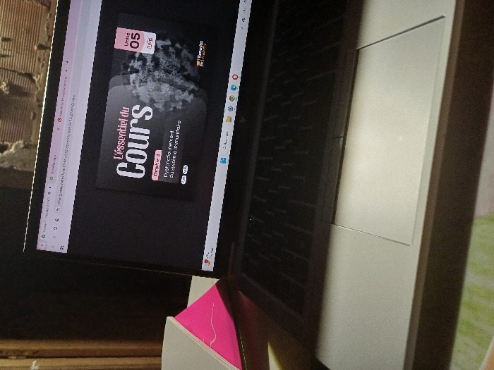 A laptop sits at an angle, displaying a webpage titled "L'essentiel du Cours" (The Essentials of the Course), labeled as Unit 05. The screen shows a dark background with a stylized image and text in French. The laptop's keyboard is visible, with a light gray touchpad area to the right. A pink sticky note is partially visible beneath the laptop, which rests on a white surface. The background includes a brick wall and a blurry green object.