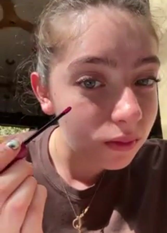 - "A woman with fair skin, hazel eyes, and dark hair pulled up in a bun is applying red dots to her left cheek with a lip gloss applicator" by FM-Gswv13, licensed under CC BY 4.0