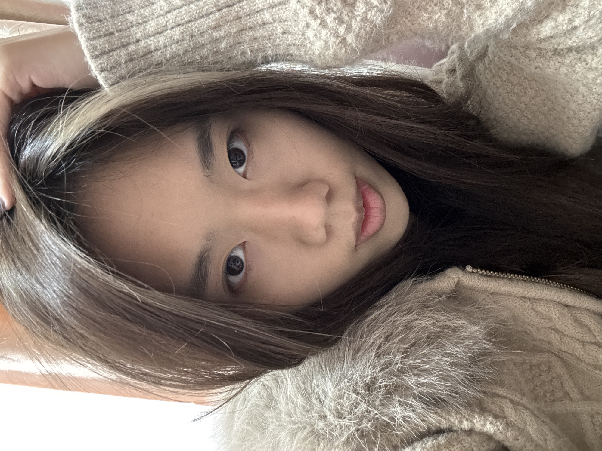 young woman with long, dark brown hair and fair skin, looking directly at the camera. She is wearing a light beige, possibly knitted sweater or jacket with a furry trim around the collar. Her right hand is raised towards her hair. The background is out of focus but appears to be indoors. The photo is taken at an unusual angle, seemingly from above and to the side. There is no verifiable information available in the image to confirm the location in the city of Shapingba District, China.