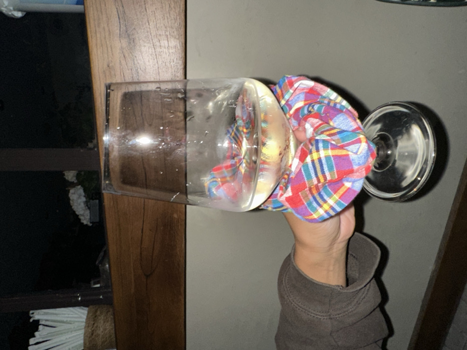 A close-up photograph depicts a person's right hand holding a clear, stemmed wine glass containing a light-colored liquid, approximately half full. A colorful plaid scrunchie, featuring a pattern of red, blue, green, yellow, and white squares, is wrapped around the stem of the glass. The hand wears a dark brown or grey long-sleeved garment with a visible cuff. The immediate background shows a light grey wall or surface beneath a horizontal wooden beam or sill. Above the wooden element, the background is dark and indistinct, suggesting an evening or night setting. To the upper left, a light brown woven container holds multiple white straws. A faint white object, possibly a floral arrangement, is visible beyond the wooden sill in the left-center background. The specific location within the city of Tel Aviv, Israel, cannot be determined from the visual information provided.