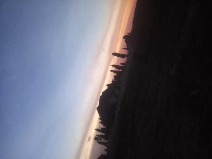 A tilted landscape photograph shows a gradient sky transitioning from blue to shades of pink and orange at sunset. Silhouetted trees and possibly buildings are visible against the colorful sky. The foreground appears dark, indicating land or vegetation. The image is taken at an angle, slightly distorting the horizon.