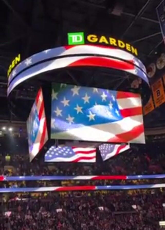 The camera films a crowded hockey arena from the stands. The jumbotron in the middle of the arena shows the American flag in an animated display. The sides of the jumbotron also display animated American flags. The edge of the jumbotron is decorated with American flag colors. "TD Garden" is visible atop the jumbotron. The lights are bright in the arena, illuminating the crowd and the rink. People in the stands are watching the display. A few people hold up their phones to record the display.