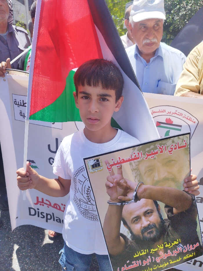 The image captures an outdoor scene in the city of Hebron, Palestinian Territory, featuring a central focus on a young boy. The boy, appearing pre-adolescent, has short dark hair, light-colored eyes, and a neutral expression, looking directly at the viewer. He wears a white short-sleeved t-shirt with a visible "HI COLLEGE" logo and blue denim shorts. The boy holds an upright Palestinian flag with his left hand, the red, black, white, and green flag extending vertically behind his left side. With both hands, he holds a rectangular poster in front of him. The poster features two images of men; a lighter, older man's portrait at the top and a more prominent image below of a bearded man with a mustache, wearing a dark shirt. This man's left hand is visibly cuffed, while his right hand forms a V-sign. Arabic text at the top of the poster reads "Palestinian Prisoner's Club" (نادي الأسير الفلسطيني), and at the bottom, "Freedom for the captive leader Marwan Barghouti (Abu al-Qassam)" (الحرية للأسير القائد مروان البرغوثي (أبو القسام)) followed by "Sentenced to five life terms and forty years" (الحكم خمسة مؤبدات وأربعين عامًا). A small emblem on the top left of the poster depicts a barred window with a dove and an olive branch. In the background, behind the boy, an older man with a white mustache and a white baseball cap is visible, wearing a light blue button-down shirt with a blue pen in its pocket. Other individuals are partially visible on the far left and right. White banners with Arabic text and some English words, including "Displace," are held horizontally across the background. One banner section clearly displays a logo resembling the Palestine Liberation Organization emblem, featuring a map of Palestine with a flame. The scene is illuminated by bright sunlight, suggesting a daytime setting, with some green foliage visible in the upper right. The ground is a dark, paved surface.