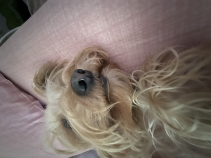 The image displays a close-up, high-angle view of a single domestic canine, identified as a small, long-haired dog, in an indoor setting within Yambol, Bulgaria. The exact location within Yambol is not discernible from the visual data. The dog, possessing light brown to blonde fur, is positioned supine on a pink, textured fabric surface, likely a pillow or blanket. Its head is slightly rotated, with its prominent black nose and visible nostrils centered in the frame, pointing upwards and towards the viewer's right. The dog's eyes are obscured by its fur and head position. No other individuals or direct interactions are evident. A dark, undefined object or shadow is partially visible in the lower right background. The scene is illuminated by soft, diffused lighting.