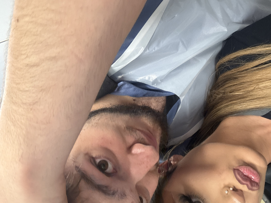 The image depicts two individuals in a close-up, angled shot, appearing to be an indoor setting, reportedly located in Erstein, France. A male-presenting individual occupies the upper portion of the frame, positioned above and to the right. He has dark hair, a beard, and brown eyes, looking towards the viewer with a slight smile. He wears a blue collared shirt beneath a white, disposable plastic apron or coverall. His bare right forearm extends across the top of the image, displaying light hair. A female-presenting individual is situated in the lower portion of the frame, below and to the left of the male. She has long, light brown hair, visible styled eyebrows, and lips coated with a glossy substance. Two small metallic piercings are visible on her nose, one on the nostril and one on the septum. She also looks towards the viewer. The background is indistinct and appears to be a light-colored, plain interior surface. The subjects are positioned in very close proximity, suggesting a posed interaction such as a selfie.