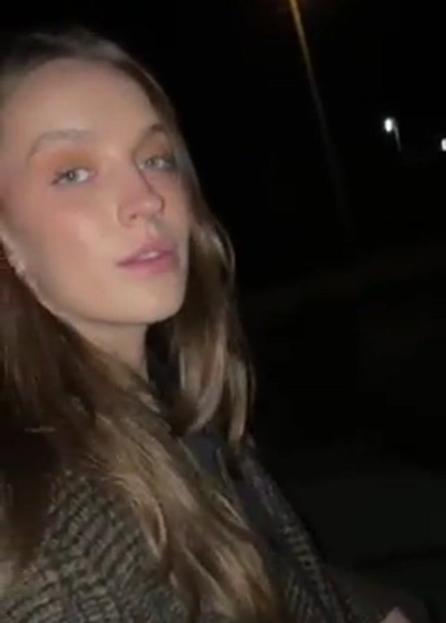 A woman with long brown hair, fair skin, and light eyes looks directly into the camera. She is wearing a brown plaid coat. The background is dark with some indistinct features and two distant streetlights visible. She subtly smiles and glances to the side. The video is shot from a close-up angle and the camera moves slightly. The overall atmosphere is dark, with the woman's face being the main point of focus.