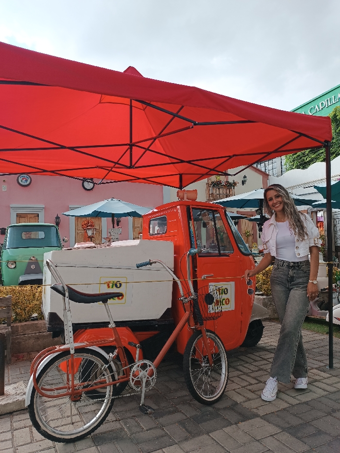 A woman stands next to an orange three-wheeled Piaggio Ape ice cream truck with "Tio Rico" written on the side. An orange bicycle is parked in front of the truck. The truck is parked under a red canopy. In the background, there is a green truck, a pink building with a clock and an outdoor seating area. The ground is made of gray bricks.