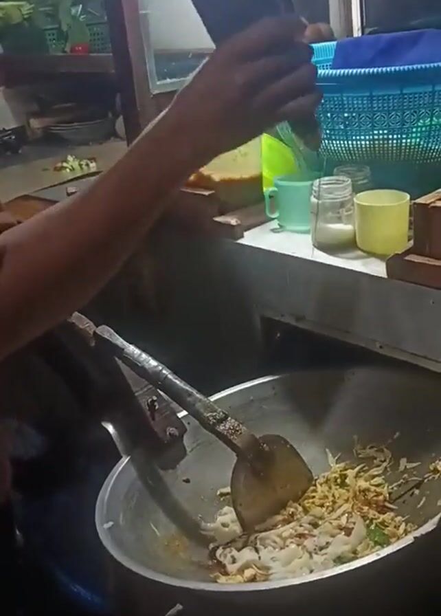 A person is cooking food in a wok. The person is holding a dark-colored bottle and pouring the contents into the wok. The wok contains ingredients such as noodles, vegetables, and what appears to be eggs. There are two wooden spatulas inside the wok. The cooking station is cluttered with various containers, cups, and a blue basket. The lighting is dim, and the background includes a window with a sign that reads "NASGOR". The person's left arm is visible as they move the bottle.