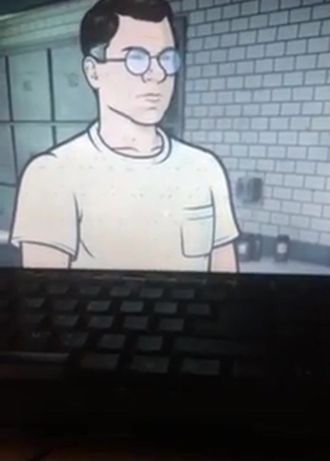 A cartoon still shows a man wearing glasses and a tan-colored t-shirt standing in a room with white brick walls