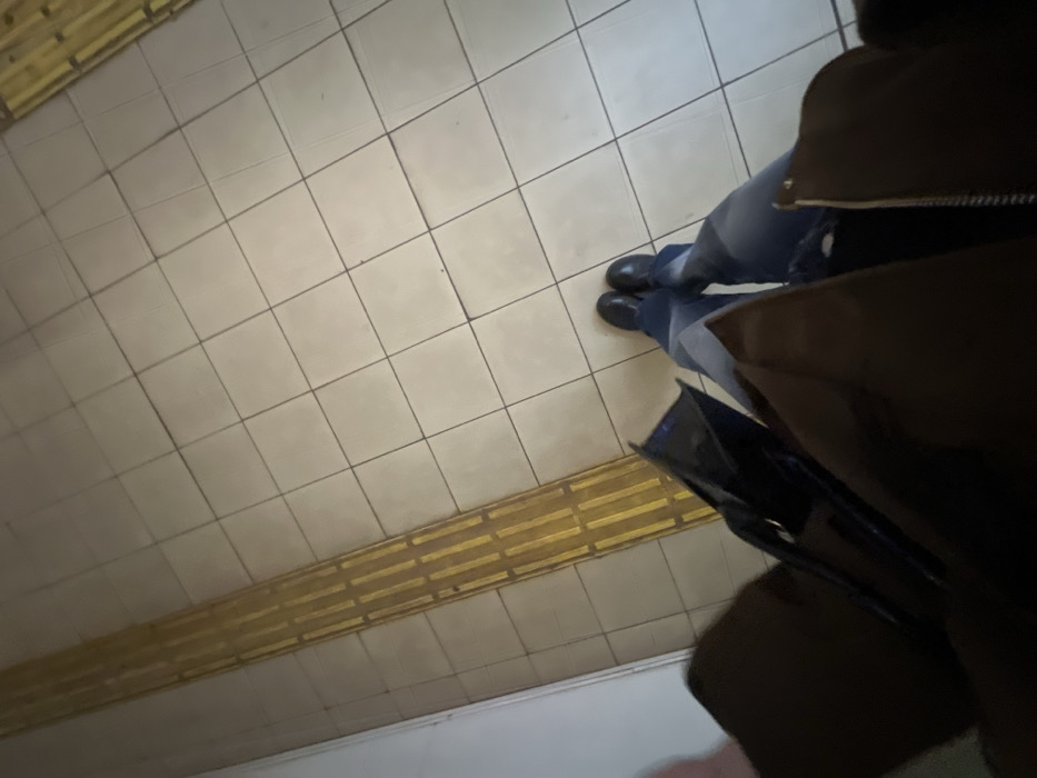 The scene depicts a first-person, downward-angled view inside a Tbilisi Metro station. An individual's lower body is visible, standing on a light-colored tiled floor with dark grout lines. A yellow tactile paving strip, featuring parallel raised ridges, runs vertically along the left side of the frame, adjacent to a plain light-colored wall. The individual is wearing multi-toned blue jeans and dark, flat shoes or boots. A dark-colored bag is positioned near the individual's left leg, and a portion of a brown garment (jacket or coat) is visible in the lower foreground. The environment suggests an indoor public transit area.