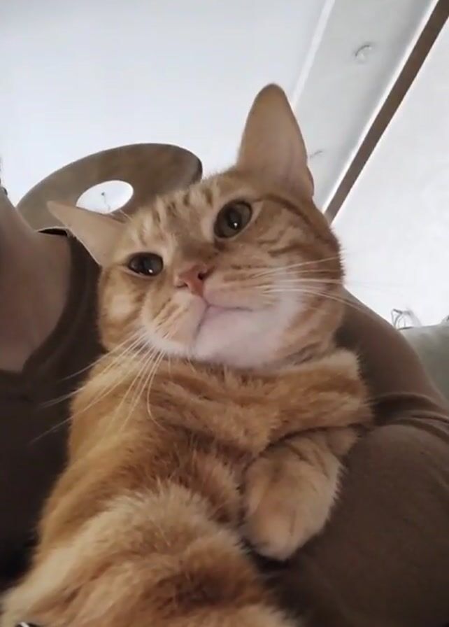 person holding an orange tabby cat. The cat is looking directly at the camera. The person holding the cat is wearing a brown long-sleeved shirt and a gold bracelet. The background shows a white ceiling and a hanging light fixture. The cat has its paws crossed. The video is shot from a low angle.
