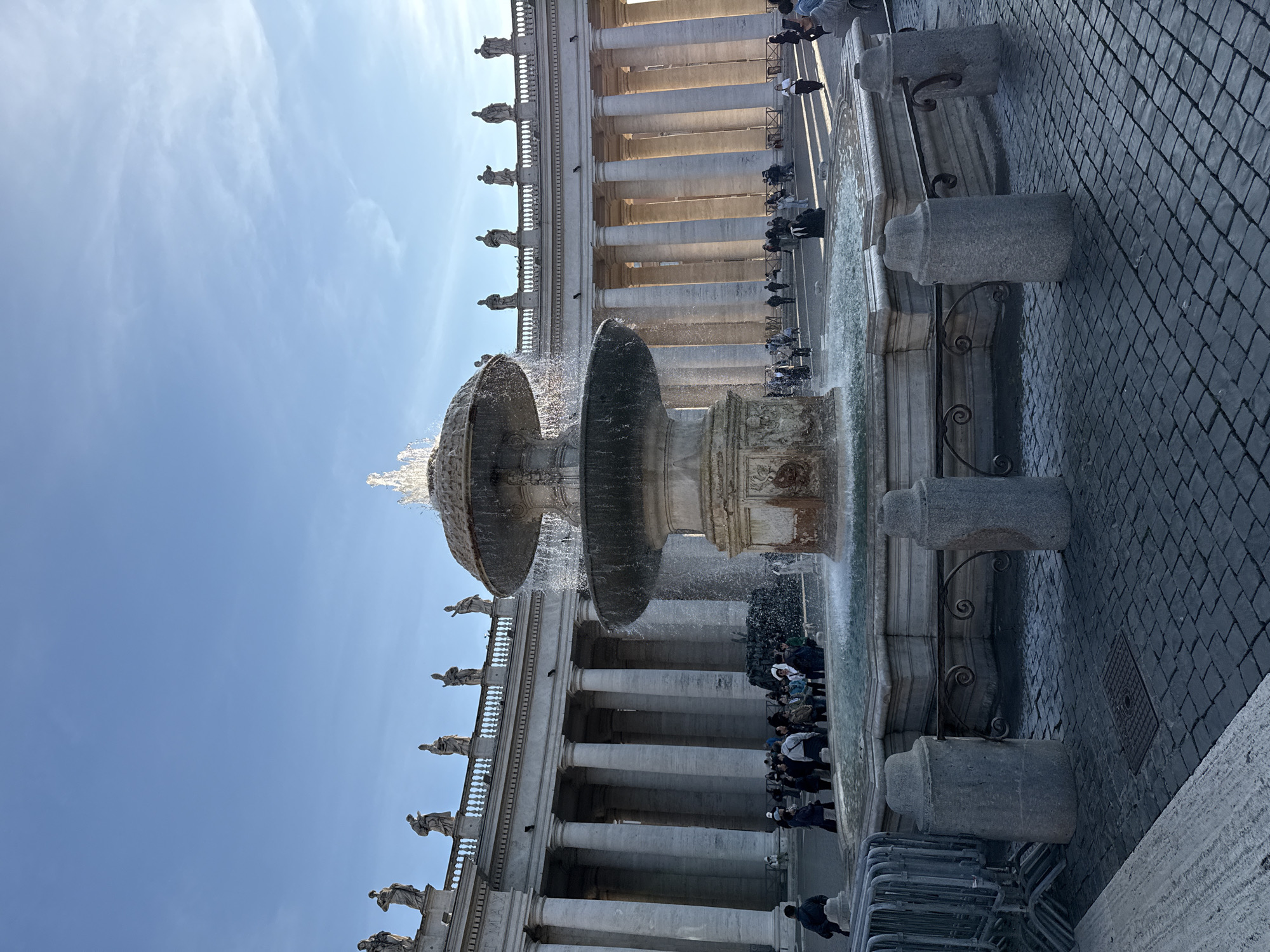 The image depicts an outdoor scene in St. Peter's Square, Città del Vaticano, Vatican City, under a clear blue sky with high, wispy clouds. The sun, positioned to the right of the frame, casts long shadows across the cobbled plaza, suggesting late afternoon or early morning. In the center, a large, two-tiered stone fountain, identified as Bernini's north fountain, is actively spraying water from a central jet and cascading into and between its basins. The fountain structure displays visible water stains and weathered stone. Its base is surrounded by a low stone border and supported by gray stone bollards interconnected by dark, ornate metal railings. In the midground and background, the iconic semicircular colonnade of St. Peter's Square is visible. This structure features multiple rows of tall, light-colored Doric columns supporting an entablature and a balustrade lined with numerous statues of saints. The columns on the right side of the frame are brightly illuminated by direct sunlight, while those on the left are partially shadowed. Numerous individuals, appearing to be tourists or visitors, are present throughout the square. A notable cluster stands near the colonnade to the left of the fountain. Others are dispersed across the cobblestone plaza, walking or observing the surroundings. In the immediate foreground to the left, a stack of metallic crowd control barriers is present. The ground is uniformly paved with dark gray cobblestones.