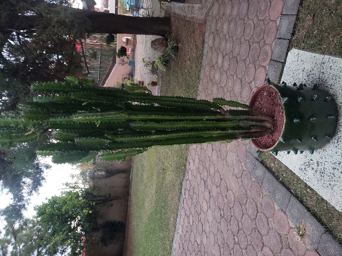 A tall, green cactus-like plant stands in a pot filled with reddish soil. The spiky plant has multiple vertical stems. The pot is dark green with protrusions resembling spikes. It rests on a gray surface next to a brick path. The background features a green lawn, trees, and a glimpse of a house.