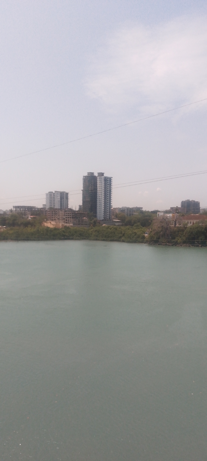 The image presents an expansive view of Tudor ward, Kenya, observed from an elevated perspective across a body of water. The foreground features a calm, light blue-green water surface with minor textural variations. A dense strip of green vegetation, consistent with mangroves, borders the water and separates it from the urban landmass. The mid-ground and background are occupied by an urban skyline dominated by numerous multi-story buildings. Two prominent high-rise structures stand in the center-right; one is a light-colored, seemingly completed or near-completed residential building with visible balconies, while the adjacent structure to its left appears darker and is actively under construction, partially obscured by scaffolding. Additional multi-story buildings, some complete and others exhibiting exposed concrete frameworks indicative of ongoing construction, extend across the visible cityscape. The sky, occupying the upper third of the frame, is hazy and light blue, with faint, diffuse white cloud formations. Two thin, dark horizontal lines, likely utility wires, traverse the upper section of the image, above the distant buildings. No individuals or discernible activities are observed within the scene.