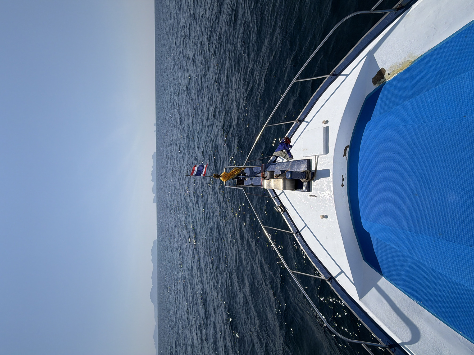The image depicts a forensic, matter-of-fact view from the bow of a white and blue motorboat underway on open water near Rawai, Thailand. The dark blue sea exhibits rippling waves with numerous sunlit reflections across its surface, extending to a clear horizon. Above the horizon, a series of distant, low-lying landmasses or islands are silhouetted against a uniform, light blue sky. The boat's white hull and deck occupy the lower portion of the frame, bordered by stainless steel guardrails along both sides of the bow. A prominent blue, textured matting covers the forward deck area. Centrally positioned at the bow is a short flagpole displaying the national flag of Thailand (red, white, blue stripes). Below the flag, a yellow garland is suspended. On the port side of the bow deck, a folded blue garment or tarp is visible. On the starboard side, a small white plastic cap or bung is present on the deck surface. No individuals are visible in the scene. The overall environment suggests clear weather conditions in the Andaman Sea, off the coast of Rawai, Phuket.