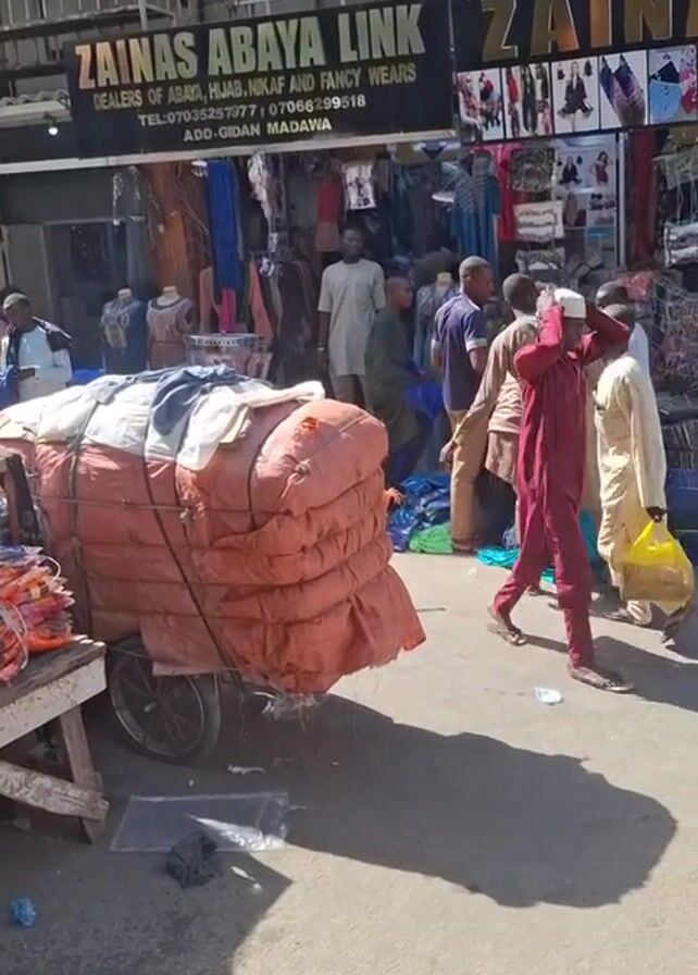 The video captures a scene at a bustling market or shopping area, likely in an African or Middle Eastern setting, as evidenced by the clothing and store names. The focus is on a shop named "Zainas Abaya Link," which appears to sell traditional garments like abayas, hijabs, and nikafs. A large, reddish-brown bundle, possibly containing textiles, is secured on a wheeled cart in the foreground. Several men dressed in traditional attire are visible, some standing near the shop, seemingly engaged in conversations or browsing merchandise. People are moving around, walking in different directions. The setting appears to be an outdoor marketplace with stores lining the street.