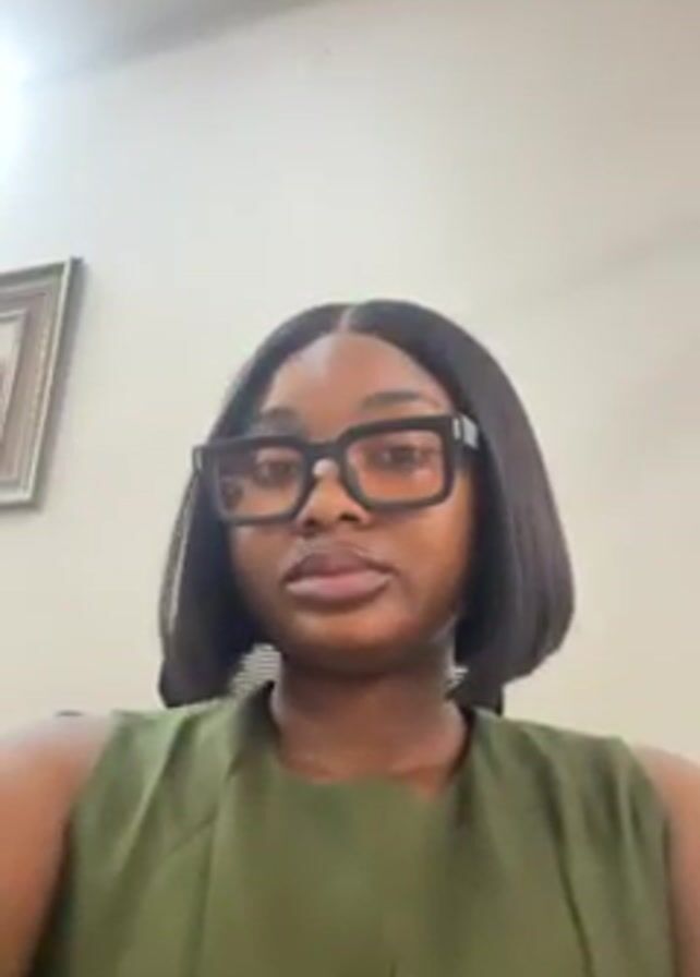 A medium shot shows a woman with dark skin, black rectangular glasses, and a short dark bob haircut. She wears a sleeveless, olive green top. The background is a plain, light-colored wall with a framed picture visible in the upper left corner. The woman is looking directly at the camera.