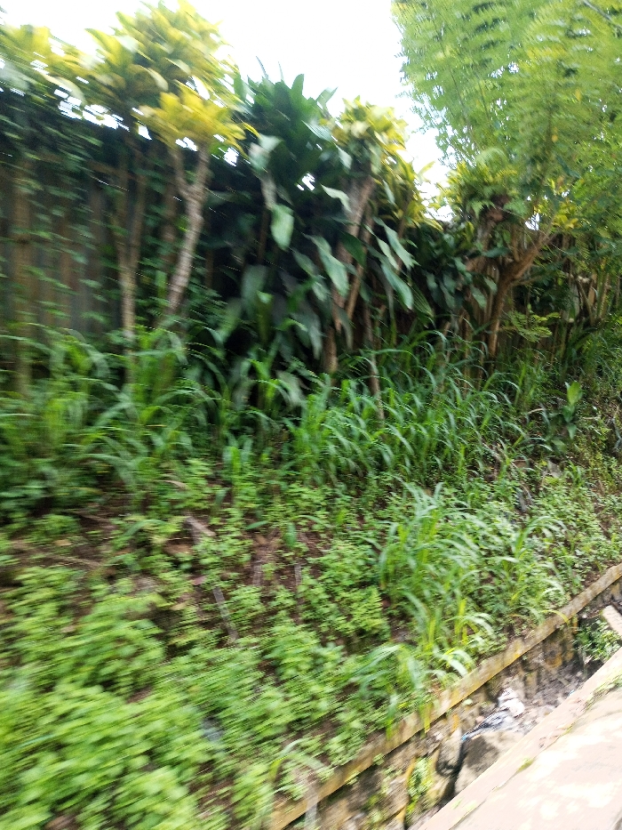 The image displays a vegetated roadside embankment in Kandenuwara, Sri Lanka. A concrete drainage channel, partially filled with sediment and debris, occupies the lower right segment of the frame. The ground slopes upward from the channel, densely covered by various green grasses and small plants, which exhibit significant motion blur. Above this lower vegetation, a row of taller, slender-trunked plants featuring large green and yellow-green leaves forms a dense natural barrier. Behind these plants, a section of a vertical concrete fence or wall is discernible, partially obscured by climbing vines. The upper portion of the frame reveals a bright, possibly overcast sky and additional green tree canopy on the far right. No human figures, animals, or specific actions are depicted. The photograph exhibits notable motion blur across the foreground and midground vegetation, consistent with capture from a moving vantage point.