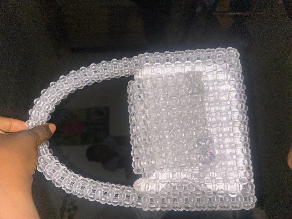 A handcrafted purse made from clear, transparent beads is presented. The bag's rectangular body and curved handle are entirely constructed from connected beads. White fabric appears to line the inside, providing structure and concealing the contents. The purse features a beaded clasp and is adorned with decorative beaded embellishments. Part of a dark-skinned hand holds the bag's handle, and the image is taken against a dark background.