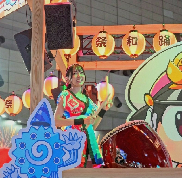 A young East Asian female is depicted within a festival-themed stage setup in a large indoor event space in Chiba, Japan