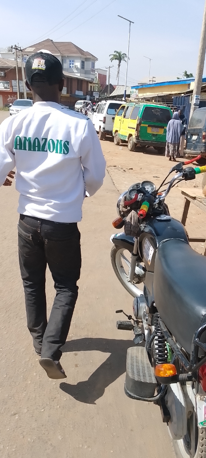 A daylight street scene, presented as occurring in the city of Sardauna, Nigeria, depicts an individual walking away from the viewer on an unpaved, dusty road surface. This person is wearing a white long-sleeved jacket with "AMAZONS" printed in green capital letters across the back, black jeans, and dark open-backed shoes or sandals. A black baseball cap with a white emblem is worn backwards on their head. To the immediate right, a black motorcycle is parked, angled towards the left. Its handlebars feature grips in red, yellow, and green colors, and a light-colored cloth is draped over the front. Visible components include a black seat, a silver front wheel, and an amber turn signal. In the background, the road extends into an urban area with vehicular traffic and pedestrians. A line of vehicles includes multiple white vans, a distinctive yellow and green minibus, and other darker vehicles. Several individuals are present among the vehicles and near roadside structures, one of whom is dressed in a grey hooded garment. The environment features various buildings, including a multi-story structure with a brown tiled roof and another with light-colored walls and blue-framed windows. Utility poles and modern streetlights are visible, along with a tall palm tree against a clear, light blue sky. Shadows suggest a high sun angle.
