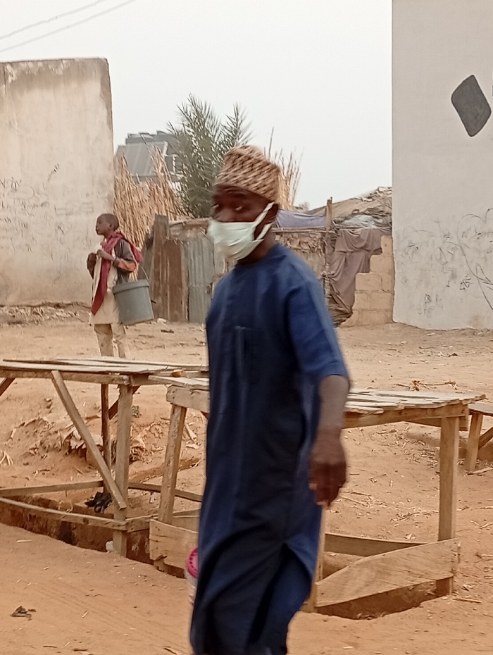 A man wearing a patterned cap and surgical mask walks towards the camera, clad in a dark blue robe. Behind him and to the left, a younger individual carries a bucket, a maroon cloth slung over their shoulder. Wooden structures resembling simple tables or stands are visible in the foreground, while buildings and sparse vegetation populate the background, creating a somewhat cluttered outdoor scene. The lighting suggests a hazy or overcast day.