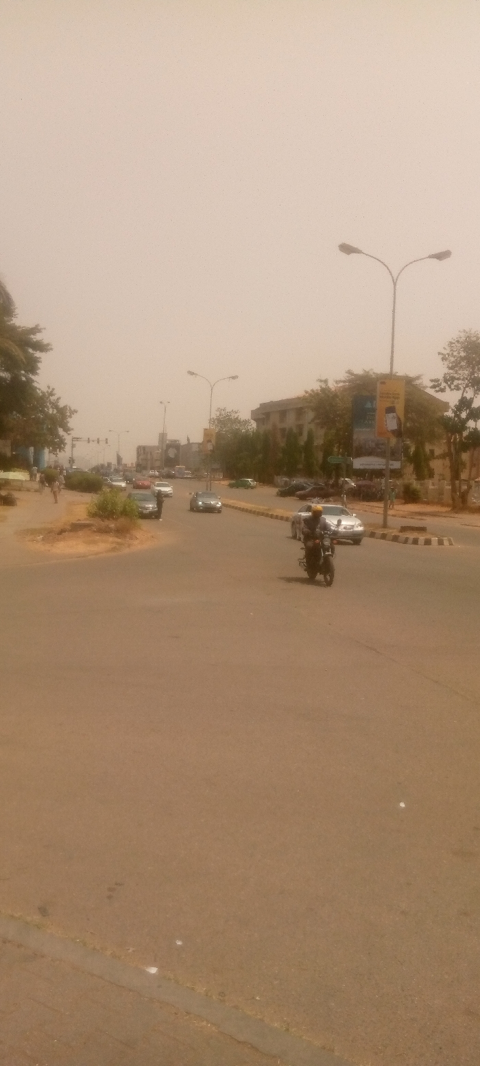 The image displays a wide-angle view of a dusty urban road scene in Abuja, Nigeria, characterized by a pale, yellowish-brown sky indicative of a hazy or harmattan atmosphere