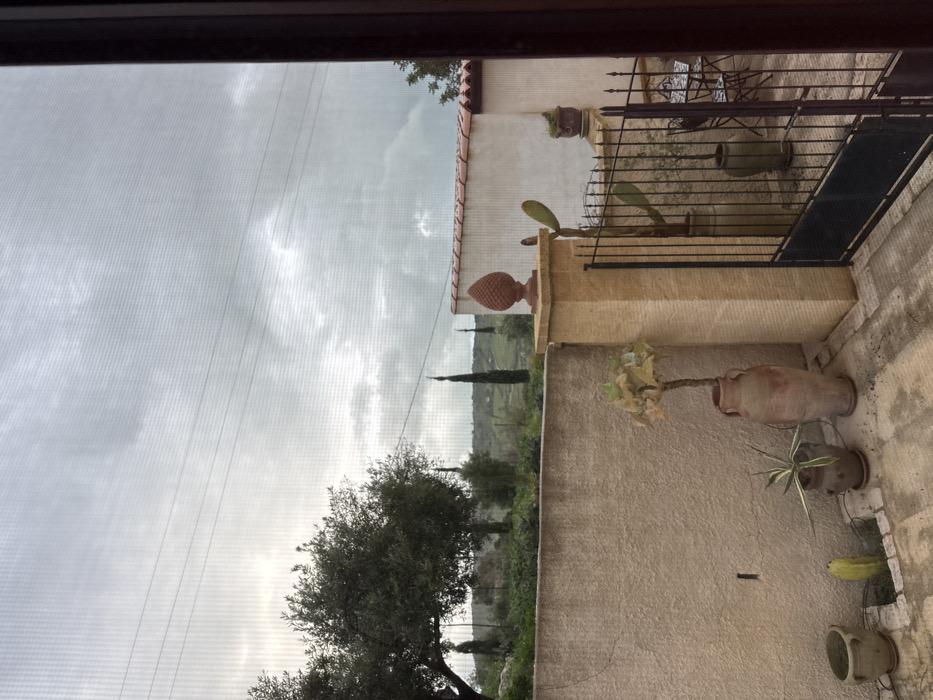 A view through a screened window reveals a cloudy sky and a glimpse of a rural landscape. In the foreground, a building with a tiled roof has potted plants and decorative features on its exterior. A balcony with a black railing is visible. The landscape includes trees, distant hills, and a cypress tree, creating a serene, rustic scene.