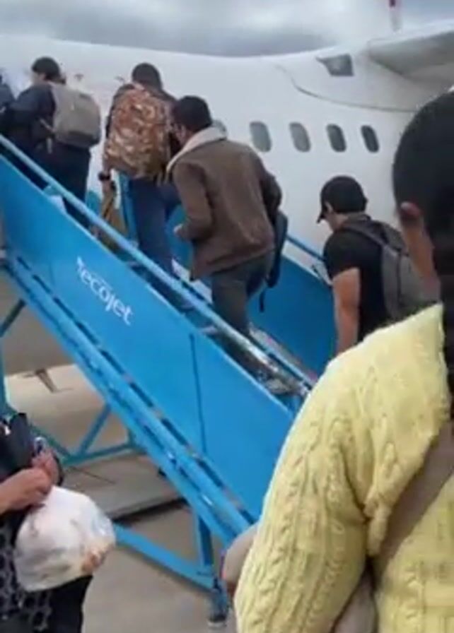 passengers boarding an Ecojet airplane via stairs on the tarmac. Several people are walking up the blue stairs into the plane, while others stand on the ground near the plane's engine. Airport personnel in yellow vests are visible near the aircraft. The sky is overcast.
