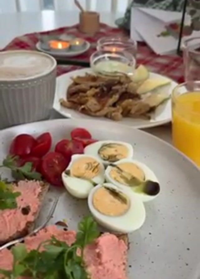 A breakfast table setting features a speckled plate with two slices of rye bread topped with a pink spread and garnished with parsley, alongside halved boiled eggs and cherry tomatoes. In the background, another plate contains crispy fried meat strips with green apple slices and a small dish of sauce. A mug of cappuccino, a glass of orange juice, and lit candles contribute to the ambiance. The table is covered with a white tablecloth and a red plaid runner, placed near a window with white curtains.