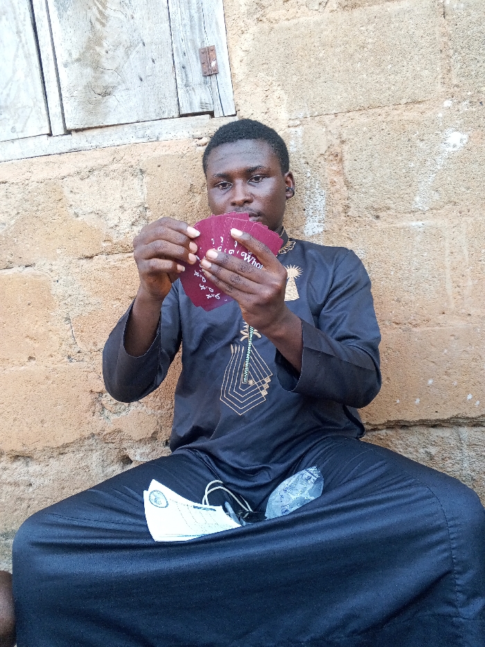 A male individual is depicted sitting cross-legged against a light brown concrete block wall, with a weathered wooden window or door frame visible in the upper left. He wears a black kaftan featuring gold embroidery on the chest and collar. The subject holds a fanned hand of several maroon playing cards, displaying white text including "Who." A white disposable face mask and a crumpled clear plastic item rest on his lap. He gazes directly forward. The scene is located in Akwanga, Nigeria, though no specific street address or landmark within the city is discernible from the visual evidence.