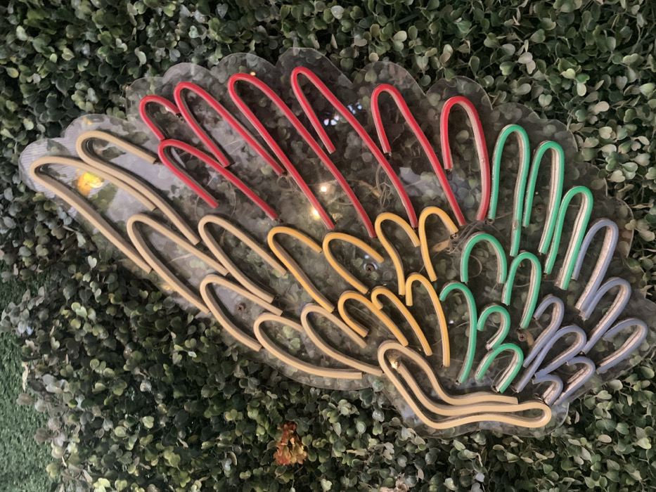 A multi-colored, wing-shaped decorative sign is affixed to a wall covered in artificial green foliage, located in Ikeja, Nigeria. The sign, resembling a bird's right wing viewed from above, consists of numerous curved, opaque tubes arranged in feather-like segments on a clear acrylic backing. The innermost and uppermost segments are beige, followed by a middle section of yellow tubes. The outer and lower segments feature rows of red, green, and light blue/grey tubes, respectively. The tubes do not appear illuminated. Multiple screws secure the acrylic backing to the artificial foliage. The background consists of dense, small, bright green artificial leaves, with a small cluster of dried, reddish-brown leaves visible in the lower-left portion of the image. No people, actions, or interactions are present in the scene.